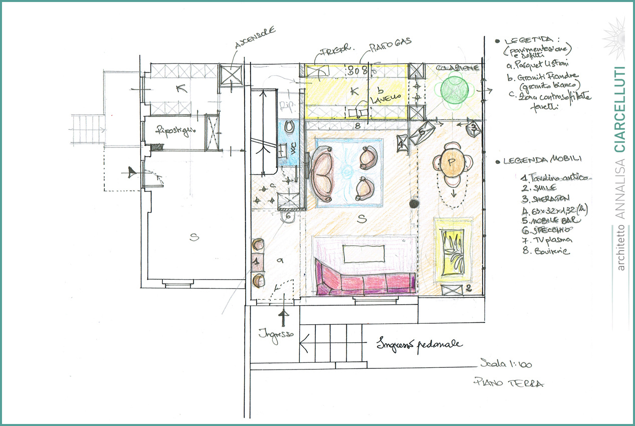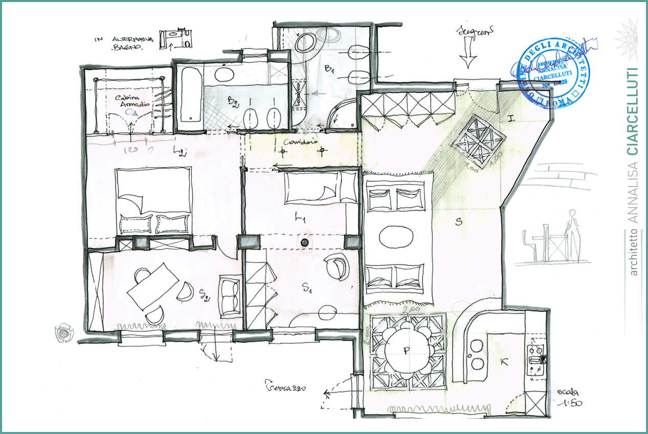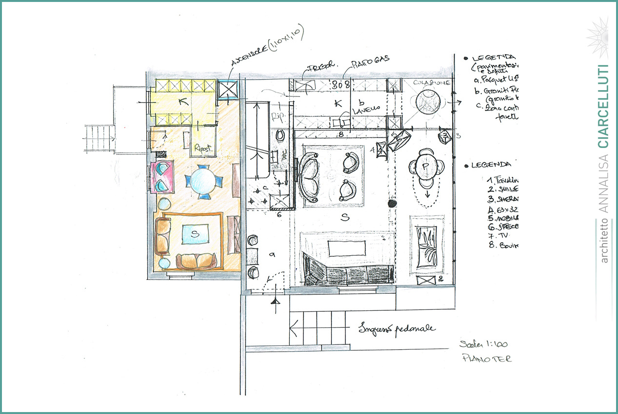 La sua formazione, proveniente dalla scuola di Paolo Portoghesi, propone idee di progetto che partono da schizzi fatti a mano libera fino alla loro concretizzazione nel progetto finito.